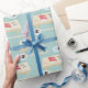 This simple and cute wrapping paper features a light teal blue background with patterns of sushi on a board and a pair of chopsticks. Personalize for your needs. You can find more matching products at my store.