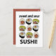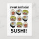 Sushi Sweet and Sour Sushi Postcard original design by Nisha Prabhu. Dive into a delectable world of flavours with our Sushi Sweet and Sour postcard! Perfect for sushi lovers and foodies alike, this vibrant design captures the tantalizing essence of your favourite Japanese dish in a burst of colours and creativity. Each sushi piece pops with freshness and zest, making it an eye-catching addition to your collection or a fun surprise for a friend! Whether you're celebrating a birthday, sending a quick note, or just craving a taste of the exotic, this postcard is sure to bring a smile to anyone's face. Ideal for sushi enthusiasts and culinary adventurers.