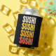 Simple colourful text design with "Sushi, Sushi, Sushi, Sushi" text in beige, yellow, orange and red colours