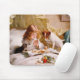 Vintage illustration of a lovely young girl praying before having breakfast in bed while a cute little kitten and a small dog are watching, eager to catch a piece of food. Oil on canvas by Charles Burton Barber.