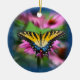 A photograph of a yellow swallowtail butterfly landing on a patch of purple coneflowers.