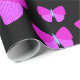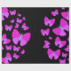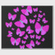 This design features a swarm of artistic butterfly representations. The wings of the butterflies feature a line pattern coloured various shades of colours like magenta and purple, while the body is coloured shades of aquamarine.