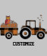 Ce modèle d'automne a un tracteur plaid à buffle orange et noir, tirant une remorque avec citrouilles. Un hibou orange vif est assis sur le dessus des citrouille. Le texte en bas peut être customisé.