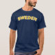Bold SWEDEN trimmed with white on a dark blue shirt, colours of the Swedish flag.