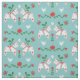 Nordic Christmas fabric featuring a pattern of Swedish Dala horses in white with details in red, blue, and green surrounded by flowers and hearts.