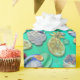 cakes, sweets, and tea with other delicious foods on a bright teal background.