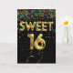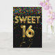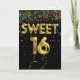 Gold sweet 16 balloons and colourful confetti on black background for Sweet 16 birthday.