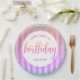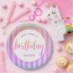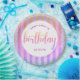 “Happy 16th birthday”. Here’s an unique addition to her birthday fête! Use this stunning, modern, tiny sparkly turquoise blue faux glitter confetti dots and yellow pink orange purple ombre typography script against a light pink and rainbow ombre glitter striped background, paper plate for an event to remember. Personalize the custom text with your guest of honour’s name. Your choice of 2 sizes: 7” or 9”. Guaranteed to add stylish fun to her special party! Matching and coordinating invitations, napkins and other birthday goodies are also available in this trendy and special collection.