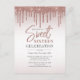 Modern and elegant sweet 16 birthday party invitation you can easily customize with your party details. Featuring glitter drips with rose gold gradient background and script typography.
