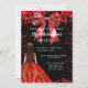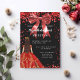 A modern, stylish and glamourous invitation for a Sweet 16, 16th birthday party. A black background with sparkles, a red dress and a red bow. The name is written with a modern hand lettered style script. Personalize and add your party details.