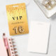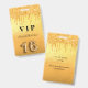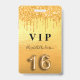 A modern, stylish and glamourous badge for a Sweet 16, 16th birthday party. A fauc gold metallic looking background with faux glitter drip, paint dripping look. The name is written with a modern hand lettered style script. With the text: VIP Number 16 is written with a balloon style font, script.
