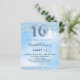 A modern, stylish and glamourous invitation for a girl's Sweet 16, 16th birthday party. A white and light blue sky as background with light blue faux glitter drip, paint dripping look. The name is written with a modern black coloured hand lettered style script. Personalize and add your party details. Number 16 is written with a balloon style font, script.