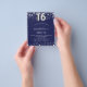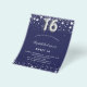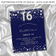 A modern, stylish and glamourous invitation for a Sweet 16, 16th birthday party. A navy blue background, decorated with faux silver stars. Personalize and add your name and party details. Number 16 is written with a balloon style font.