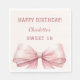 A soft ivory colored background color. Decorated with a large pink bow. Personalize and add the name and date. Text: Happy Birthday!