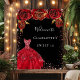 A welcome poster for a Sweet 16, 16th birthday party. A black background with faux glitter dust, a red dress and red roses, florals. Personalize and add a name.