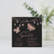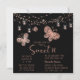 Sweet 16 Rose Gold Butterfly Chic Modern Birthday Invitations features elegant rose gold butterflies with string lights on a black background with your Sweet 16 Invitation information below. Personalize by editing the text in the text boxes. Designed for you by ©Evco Studio www.zazzle.com/store/evcostudio