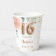 For an elegant Sweet 16, 16th birthday party. A white background. On the front and the back: Personalize and add a name and a date. Decorated watercolored rose gold and blush pink florals, eucalyptus greenery and faux glitter dust. Nr 16 is written with a balloon style font.