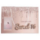 A gift bag for a girly and glamourous Sweet 16, 16th birthday. A rose gold gradient background with rose gold and pink faux glitter drips, paint dripping look. Personalize and add a photo and name of the birthday girl. The word Sweet 16 is written in rose gold with a balloon style font.