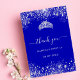 A Sweet 16, 16th birthday thank you card. A royal blue background color. Decorated with faux silver glitter, sparkles. On front large white hand lettered script and the text: Thank You.