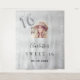 A welcome tapestry for a girly and glamourous Sweet 16, 16th birthday party. A faux silver metallic looking background decorated with faux glitter dust. Personalize and add a high quality photo, name and date. Number 16 is written with a balloon style font.