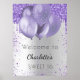 A welcome banner for a girly and glamourous Sweet 16, 16th birthday party. A faux silver looking background decorated with violet, lavender coloured faux glitter drips, paint dripping look, balloons. Personalize and add a name and age.