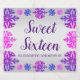 Winter snowflake sweet 16 birthday featuring textured snowflakes in shades of purple, pink and blue on a silver gradient background