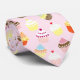 A pattern of colourful, sweet cup cakes in different styles. The background is light pink and the cupcakes are yellow, pink, orange, blue, brown and green. Some have polka dots, flowers, stripes or sprinkles. They have a cherry or a heart on top of the frosting.