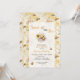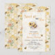 This honeycomb baby shower invitation features a “Sweet as can Bee” theme with a smiling bee holding a sunflower, surrounded by floral elements and bees. The warm honeycomb background adds a soft and playful touch.