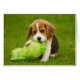 A very sweet beagle puppy plays with his large cuddly toy in the garden.