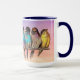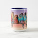 L'avant de cette tasse présente une illustration vintage de petits oiseaux douces, recréés numériquement par moi dans un style artistique coloré, sur un arrière - plan à l'ombre du coucher du soleil. l'intérieur de la tasse et de la poignée sont d'une couleur violette, mais la poignée et la couleur intérieure peuvent être changées si désiré.