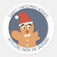 This fun Christmas round sticker features a sweet bitten gingerbread man with a red hat, in an elegant blue background.