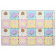 Satisfy your sweet tooth with this colourful pattern featuring tasty treats like a chocolate ice cream cone, a purple frosted chocolate doughnut, a lemon yellow macaron, and a pink and white swirled lollipop separated by chocolate chips and surrounded by rainbow sprinkles on four brightly hued squares.
