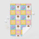 Satisfy your sweet tooth with this colourful pattern featuring tasty treats like a chocolate ice cream cone, a purple frosted chocolate doughnut, a lemon yellow macaron, and a pink and white swirled lollipop separated by chocolate chips and surrounded by rainbow sprinkles on four brightly hued squares.