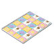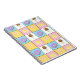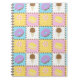 Satisfy your sweet tooth with this colourful pattern featuring tasty treats like a chocolate ice cream cone, a purple frosted chocolate doughnut, a lemon yellow macaron, and a pink and white swirled lollipop separated by chocolate chips and surrounded by rainbow sprinkles on four brightly hued squares.