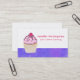 Professional business cards with an illustration of a delicious looking cupcake. Pink frosting and chocolate drizzles. A yellow cupcake holder and a raspberry on top.