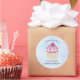 Cupcake/bakery business stickers with an illustration of a delicious looking cupcake. Pink frosting and chocolate drizzles. A yellow cupcake holder and a raspberry on top. Yummy!