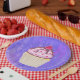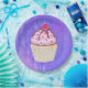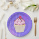 Paper plates with an illustration of a delicious looking cupcake. Pink frosting and chocolate drizzles. A yellow cupcake holder and a raspberry on top. Yummy! The background is a purple abstract texture with little hearts sprinkled around.