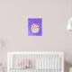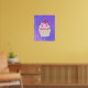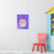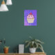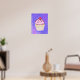 A poster with an illustration of a delicious looking cupcake. Pink frosting and chocolate drizzles. A yellow cupcake holder and a raspberry on top. Yummy! The background is a purple abstract texture with little hearts sprinkled around.