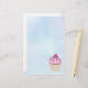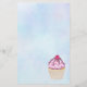 Stationery paper with an illustration of a delicious looking cupcake. Pink frosting and chocolate drizzles. A yellow cupcake holder and a raspberry on top. Yummy!