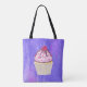 A tote bag with an illustration of a delicious looking cupcake. Pink frosting and chocolate drizzles. A yellow cupcake holder and a raspberry on top. Yummy! The background is a purple abstract texture with little hearts peppered throughout.