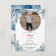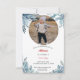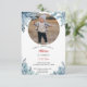 Personalize this card with your photo. Delicate, hand-painted winter forest created in a watercolor style. with blue pine branches framing the top, and bottom. A beautiful doe and deer on the back of this card. The design is festive and gives a winter holiday or seasonal feel, likely intended for invitations or greeting cards, ideal for seasonal or holiday-themed invitations.