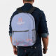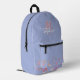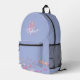 This beautiful backpack is decorated with a flower field, in slight orange and pink tones, on a light blue background.