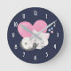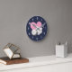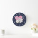 A clock with an adorable graphic illustration. A white kitty cat with a cute paw print image on her fur. Sleeping peacefully. A big pink heart behind her and some little stars too. Dark blue background.