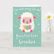 This card features a sweet, stylized lamb with fluffy white fleece and soft pink facial details, gazing forward with big dark eyes and little heart-shaped blush marks that add a tender, affectionate look 🐰. Small pink inner ears and dainty hoof-like feet complete the character as it cuddles three decorated eggs close to its chest like treasured gifts. One egg is sunny yellow with tiny purple speckles, another is spring green with darker dapples, and the third is light pink with deeper magenta accents. The background is a mint-green field sprinkled with small white and golden-yellow stars plus scattered white dots, giving the scene a gentle, celebratory sparkle 🌷. At the top, the phrase “Ewe are very special” appears in a flowing, cursive-style font in a dark tone that stands out clearly against the pastel backdrop. Near the bottom, “Happy First Easter Grandson” is set underneath in a matching dark color, centered and easy to read. The lamb sits centered on the page with the three eggs cradled in front, while the stars and dots are spaced across the mint background around it.