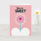 This greeting card features a soft pastel pink background that feels gentle and romantic, like a quiet blush behind a sweet note 🥰. Near the top, the text reads “You’re Sweet,” with “You’re” in smooth, flowing red lettering and “SWEET” in all-caps red letters edged with a light blue shadow. Centered below the words is a candy-like flower that looks like a lollipop turned into a sunflower, drawing your eye like a little token of affection ❤️. Its round face is made of concentric pink and white rings, surrounded by crisp white petal rays that radiate outward. In the middle sits a deep red heart, giving the design a tender, love-forward focal point without needing any extra characters. A slim pastel blue stem drops down from the flower to the bottom area, where two soft white cloud shapes sit symmetrically at the lower edge. The overall look stays flat and graphic, with the blue shadow on the top text and the red heart standing out against the pale pink field.