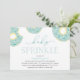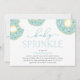 Invite friends and family to your baby sprinkle with our adorable doughnut invitations. Cute gender neutral baby sprinkle invitations feature three doughnut illustrations across the top, adorned with turquoise aqua icing and sprinkles. Add your event details in modern aqua and dark grey lettering.