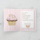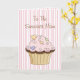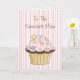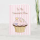 Sweet Mother's day greeting card, done in pink and white stripes. Graphic artwork of a whimsical chocolate cupcake, with pink frosting and heart sprinkles, decorates the front of the card. Brown script text reads To the Sweetest Mom. Decorated similar to the outside, the inside has a white text area, with brown script text greeting for mom. All text is ready for you to personalize for your special mother.