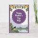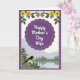This greeting card features a scalloped purple medallion centered on the front, with a short Mother’s Day message in white lettering set in the middle. Around it, an ornate border in deep purples frames the scene, adding a cozy, affectionate feel like a gentle hug ❤️. Near the top edge, a curved garland of yellow daisy-like blooms and small pink flowers weaves through fresh green leaves, like a bouquet offered with a tender glance. Below the medallion, a black-and-yellow bird with white wing bars rests on a branch dotted with berries, leaning forward as if quietly watching over the moment. Behind the branch, a calm lake stretches across the lower half, reflecting a line of evergreen trees and soft, rolling mountains. The sky is pale and lightly shaded, giving the landscape a calm, early-day softness 🌼. The message sits centered inside the purple medallion, while the flowers arc above and the bird and lake scene settle below in muted blues and greens. A patterned purple border surrounds everything, with scalloped edges and small decorative shapes repeating around the frame.