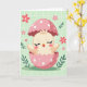 This greeting card features a newly hatched little bird nestled in the jagged top of a bright pink eggshell with white polka dots, its tiny wings lifted as if reaching toward a nearby friend. The chick is a soft cream color with closed eyes, rosy cheeks, and a small open beak, giving it a tender, content look that feels like a quiet hello. Behind it, a light pastel green background is patterned with a faint, uneven grid that adds gentle texture without distracting from the scene. Small five-petaled pink flowers and a few slender green sprigs are scattered around, like springtime notes drifting across the page 🌷. The warm pinks and soft greens sit close together, creating a cozy, affectionate mood in the way the chick seems safely held by the shell. There is no message text printed on the front, leaving open space above and around the illustration for the artwork to breathe. The eggshell’s rim curves upward with irregular cracks, and the white dots vary slightly in spacing across the pink surface 🐇.