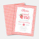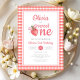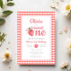 Celebrate your little Sweet One's first birthday with our darling Strawberry Girl 1st Birthday Invitation! This sweet design showcases a cute strawberry wearing a coquette pink bow on a charming red and white gingham background. Perfect for your little girl's first birthday celebration. Order now and get ready to spread the sweetness with this charming and unique invitation! Matching party accessories available.